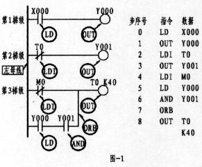 第3梯級;左邊第一個觸點為常閉,上標為M0, M為輔助繼電器(該繼電器有多種,注意類別),其指令的正確表示應為:4、LDI M0(如程序所示)。本梯級的第2行第一個觸點為常開,上標為Y000,Y表示輸出繼電器,由于該觸點與后面Y001觸點呈串聯關系,形成了所謂的電路"塊",故而其觸點的指令應為 5、LD Y000。總之LD與LDI指令從上面可以看出,它們均是左母線每一梯級第一觸點所使用的指令。而梯級中的支路(即第3梯級的第2行)有二個或二個以上觸點呈串聯關系,其第一觸點同樣按LD或LDI指令。可使用LD、LDI指令的元件有:輸入繼電器X、輸出繼電器Y、輔助繼電器M、定時器T、計數器C、狀態繼電器S。OUT為線圈驅動指令,該指令不能出現在左母線第一位。驅動線圈與驅動線圈不能串聯,但可并聯。同一驅動線圈只能出現一次,并安排在每一梯級的最后一位。如上圖中的1、OUT Y000,3、OUT Y001,Y為輸出繼電器,其線圈一旦接獲輸出信號,可以這樣認為,線圈將驅動其相應的觸點而接通外部負載(外部負載多為接觸器、中間繼電器等)。而上圖8、OUT T0 K40 為定時器驅動線圈指令,其中的K為常數40為設定值(類似電工對時間繼電器的整定)。可使用OUT指令元件有:輸出繼電器Y、輔助繼電器M、定時器T、計數器C、狀態繼電器S。