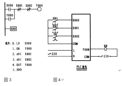 工作原理:以圖3為例說明,當外接啟動按鈕一按,X000的常開接點立即閉合電流(實為能流),流經X001、X002的常閉接點至使輸出繼電器Y000閉合,由于Y000的閉合,并接于母線側的Y000常開觸點閉合形成自保,由輸出繼電器接通外部接觸器,從而控制了電動機的運行。停止時按外部停止按鈕,X001常閉接點在瞬間斷流從而關斷了輸出繼電器線圈,外部接觸器停止運轉。當電動機過載時,外部熱繼電器常閉接點閉合,導至X002常閉接點斷開,從而保護電動機。
