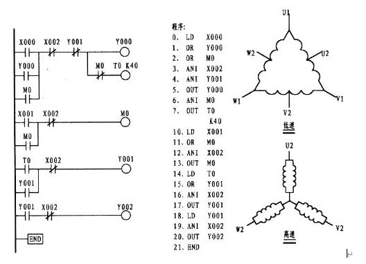 低速運行時,按外接啟動按鈕SB1,此時第二梯級接于母線一側的X001閉合,電流(能流)則通過串接于其后的X002接通中間繼電器M0線圈,使并接于母線一側的M0常開接點閉合,使M0中間繼電器線圈形成了自保。由于M0線圈的閉合,使第一梯級第二支路母線一側的M0常閉接點閉合,同時切斷了定時器線圈T0的運行,使電流接通了Y000輸出繼電器,外接的接觸器KM1接通使電動機處于三角形低速運行狀態。停止,則按外接按鈕SB1即可。這就是低速運行過程。注意:本梯形圖未設置熱保護,從原圖來看熱保就少用了一個。可在梯形圖第一梯級Y001常閉接點后串接X003,同時在第四梯級X002常閉接點后串接X004。